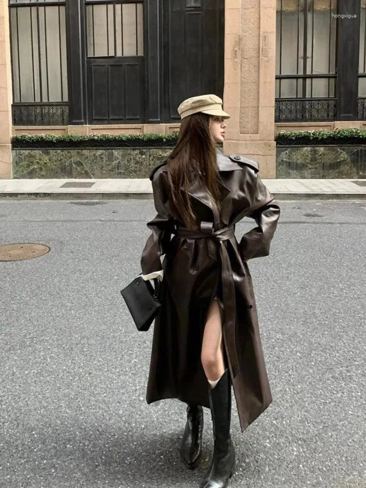 Source : 7daysactive.comWomens Leather 2024 Spring Women Long Double Breasted Belt PU